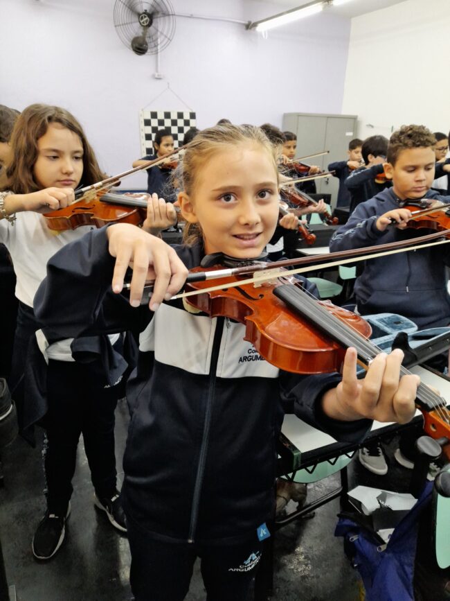 Música: cordas friccionadas Nossos alunos do 1º ao 5º ano estão trabalhando, nas aulas de Música em 2025, com instrumentos de Cordas Friccionadas. Vejam algumas fotos das aulas do 1º semestre.