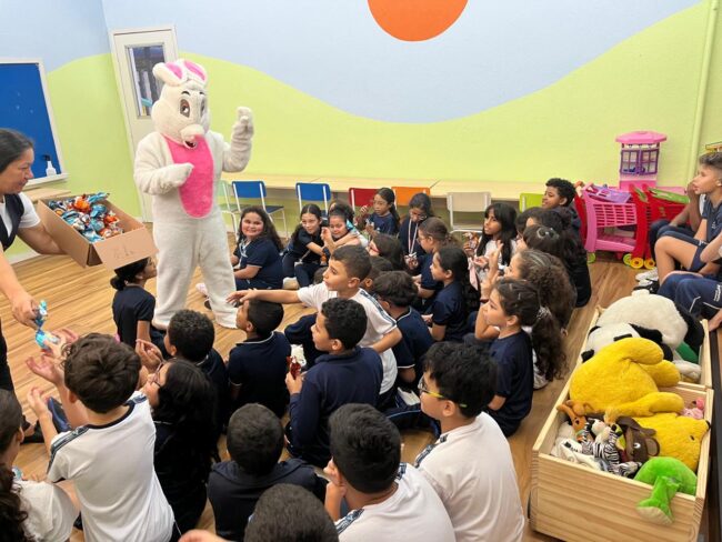 Coelhinho na Escola Coelhinho entregando ovos de Páscoa para os alunos do 1º ao 5º ano do Ensino Fundamental.